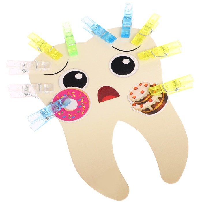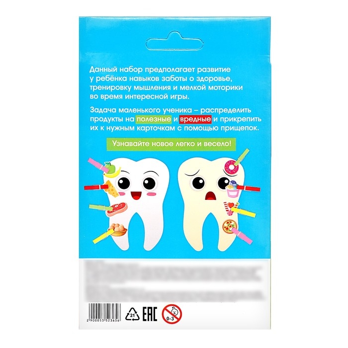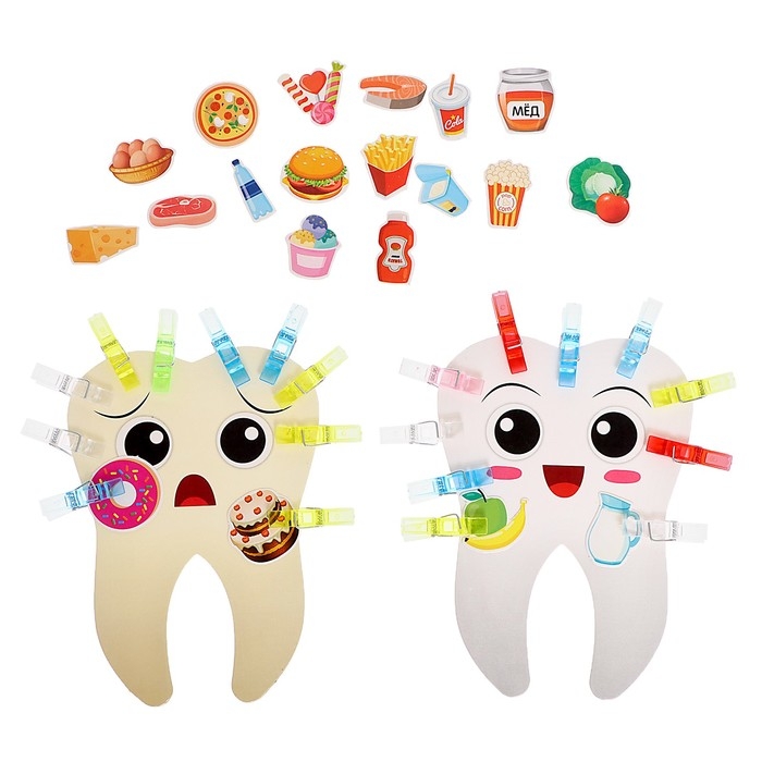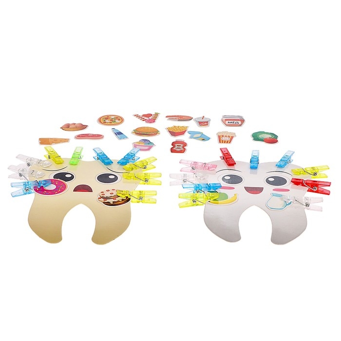 С этим набором кроха познакомится с вредными и полезными продуктами и прикрепит их к карточкам-зубам с помощью прищепок. Игра способствует развитию у ребенка навыков заботы о здоровье, тренировки мышления и мелкой моторики.