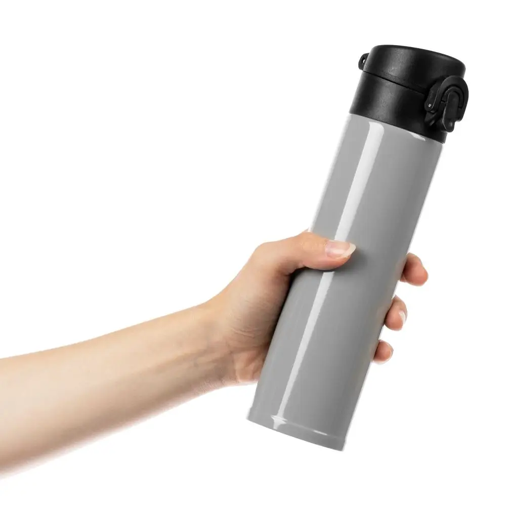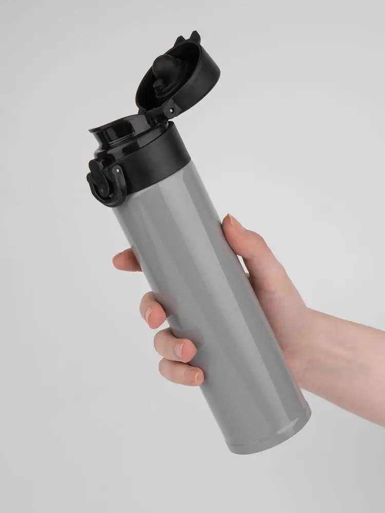 Термостакан Eimer в ровном цилиндрическом корпусе — эстетически приятная форма, на которую удобно делать круговое нанесение. Крышку с отщелкивающимся клапаном легко открыть одной рукой.