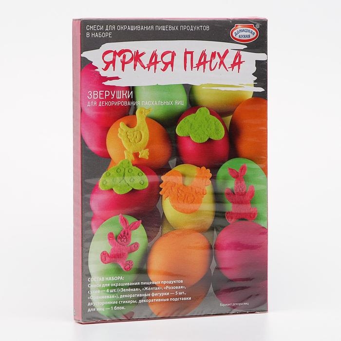 С помощью данного набора вы сможете не только покрасить яйца в четыре ярких цвета: розовый, оранжевый, жёлтый и зелёный. Также в комплект входят объемные наклейки-бабочки и декоративные подставки для яиц, которые не только украсят пасхальную композицию, но и позволят яйцам устойчиво располагаться на праздничном столе.