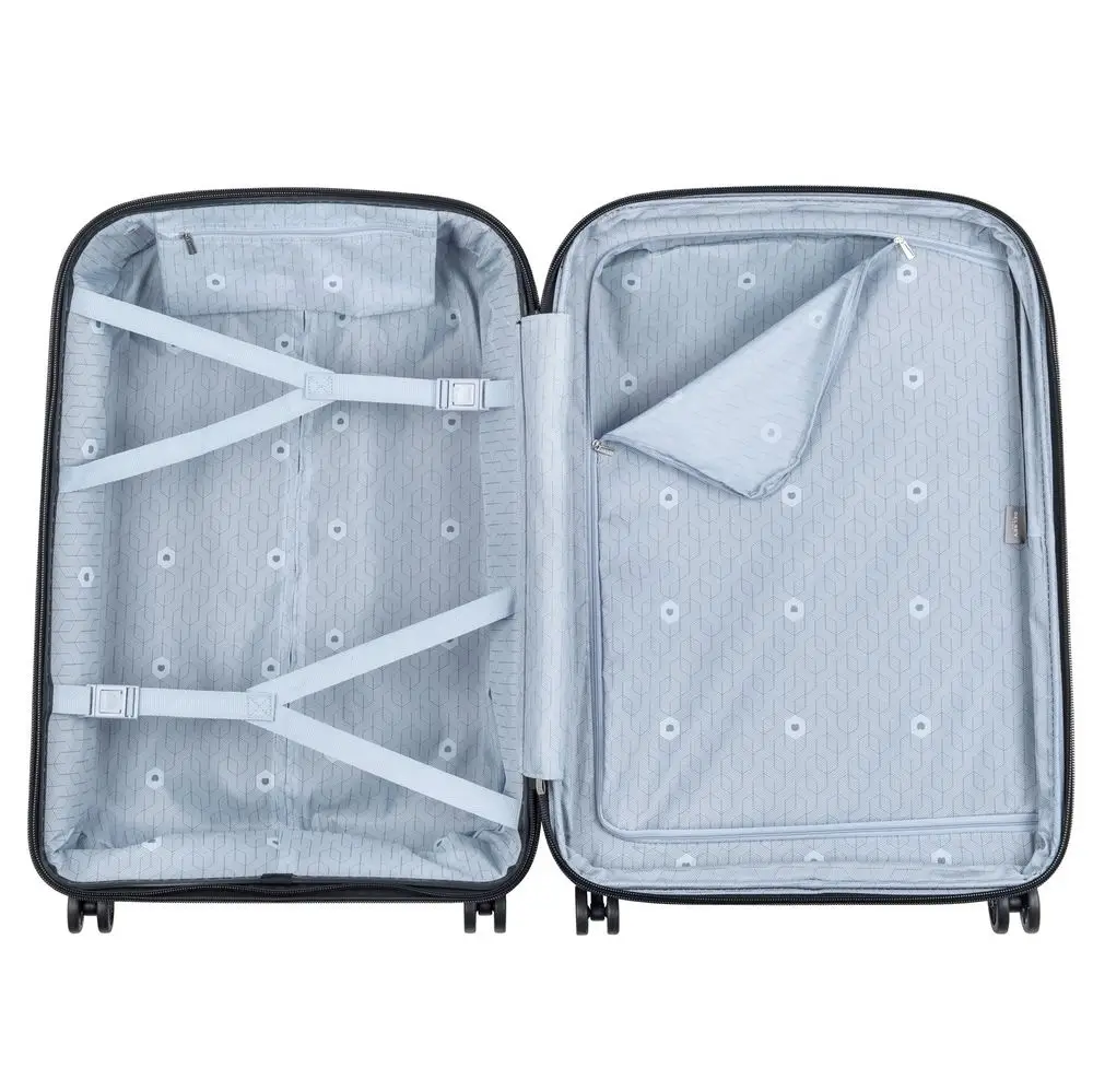 - Чемодан с 2 отделениями: одно из них с фиксирующими ремнями и карманом-органайзером на молнии, второе — с разделителем