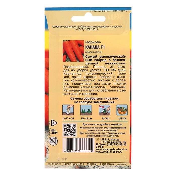 Позднеспелый (120-135 дней от всходов до технической спелости) гибрид голландской селекции. Посев семян в грунт производится в конце апреля - начале мая на глубину 1 см, расстояние между рядками 15 см. Подросшие всходы прореживают, оставляя между растениями по 5-7 см. Розетка листьев полустоячая. Корнеплод полуконический, гладкий, с ярко оранжевой окраской, длиной 20-25 см, диаметром 4-5 см. Корнеплод почти полностью погружен в почву. Масса корнеплода 80-140 г. Гибрид характеризуется устойчивостью к цветушности, высокой лежкостью. Обладает высокой устойчивостью листьев к болезням, продуктивен при самых тяжелых почвенно-климатических условиях. Рекомендован для потребления в свежем виде и хранения. Урожайность 5,5-7,6 кг/м2.