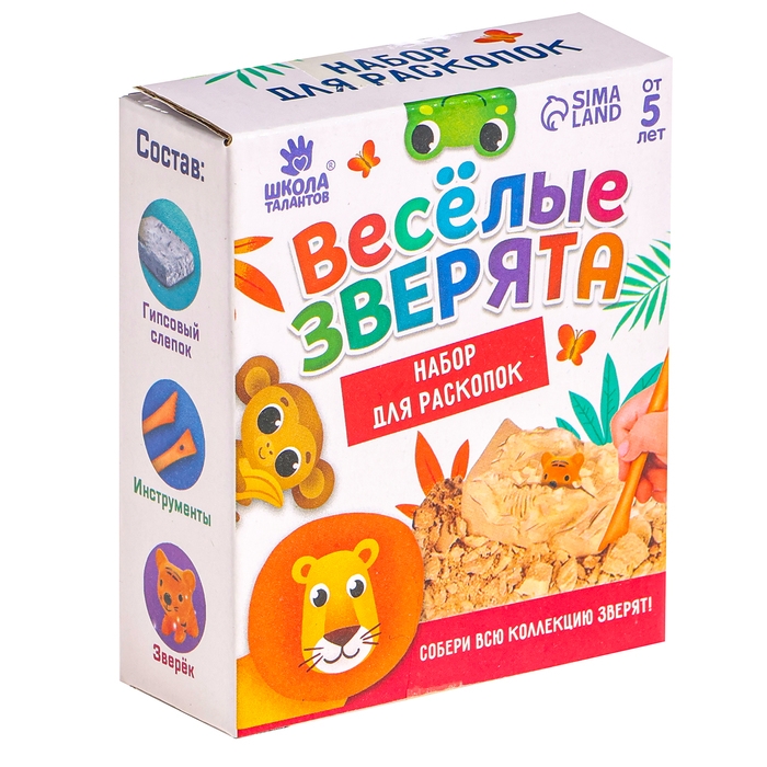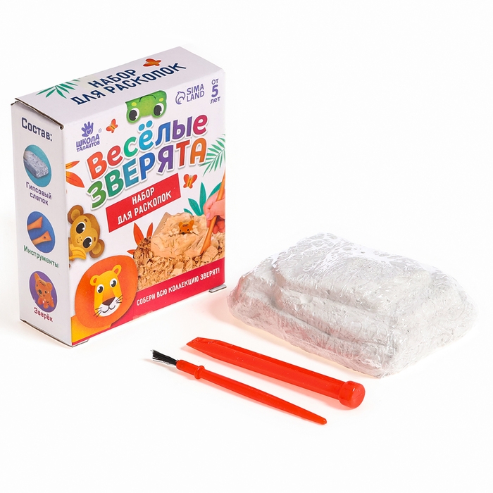 С набором из серии «Весёлые зверята» у ребёнка есть возможность устроить раскопки прямо у себя дома! Для этого нужно аккуратно снимать гипс стекой слой за слоем. А внутри слепка ждёт сюрприз.
