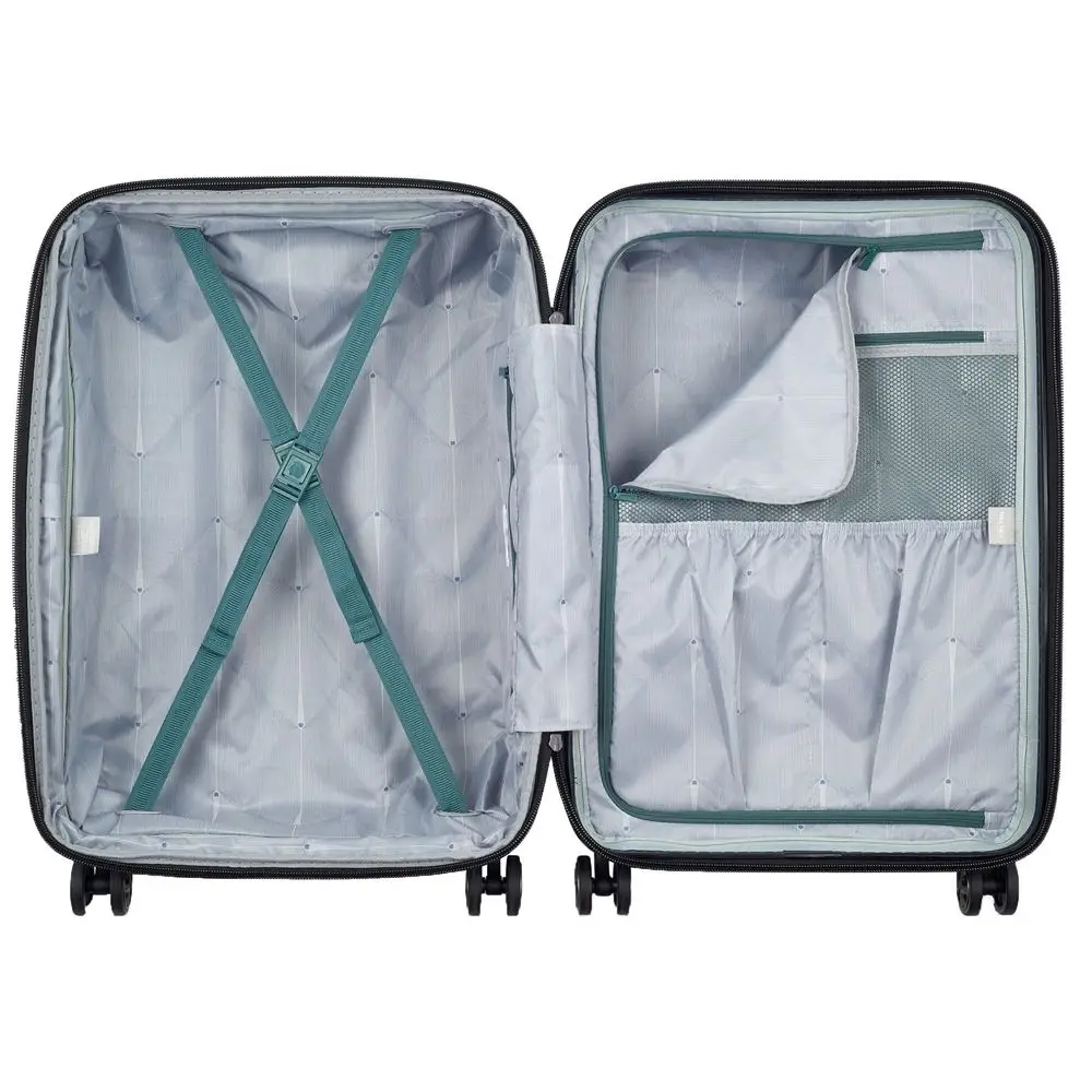 - Чемодан с 2 отделениями: одно из них с фиксирующими ремнями, второе — с разделителем и карманом-органайзером на молнии
