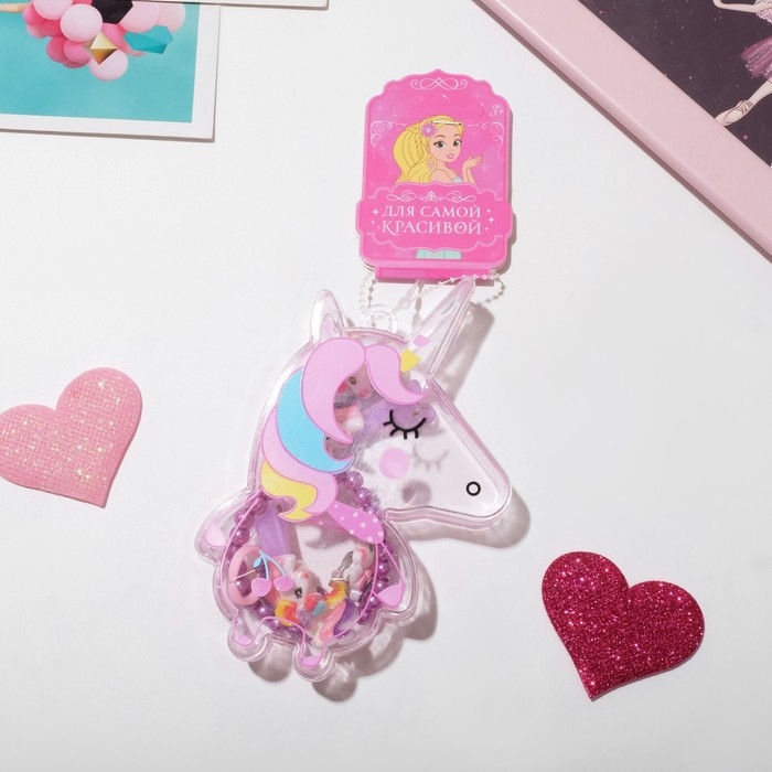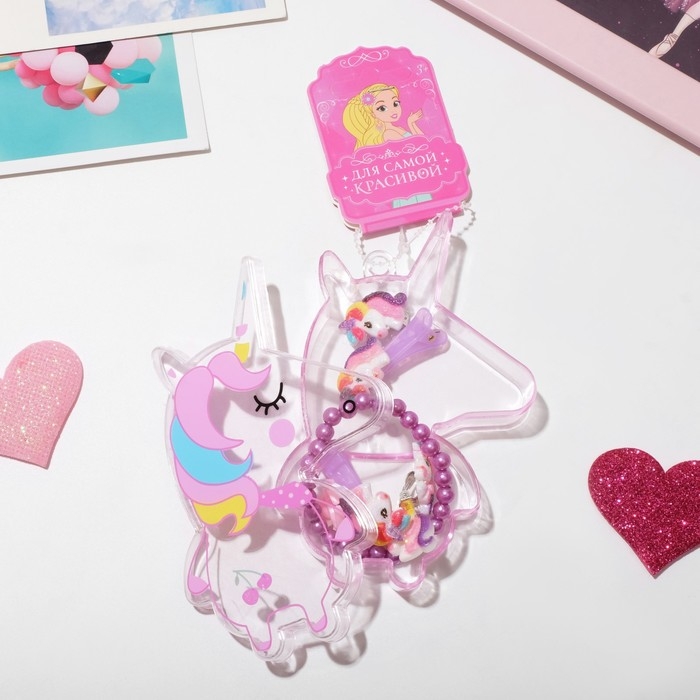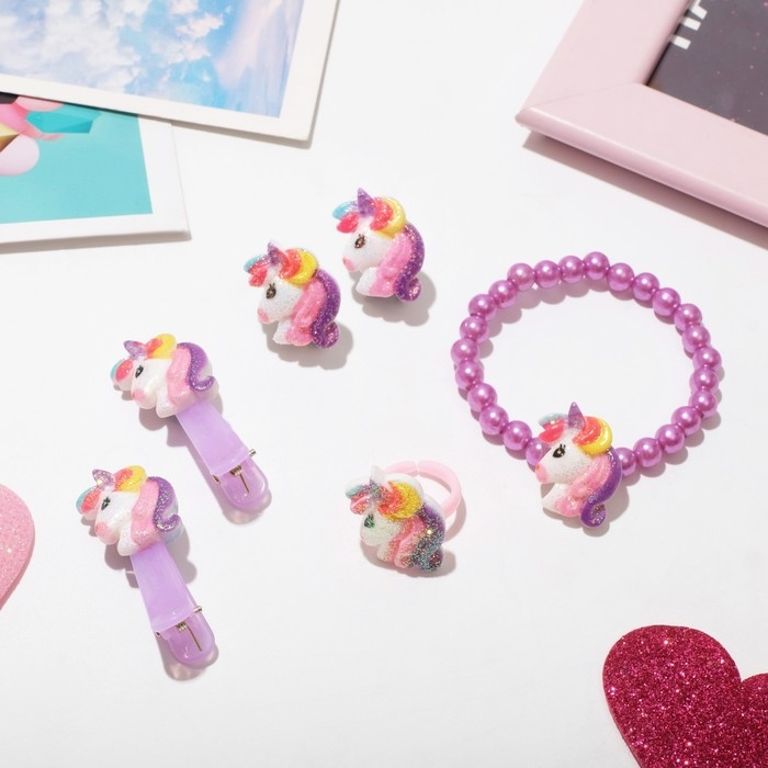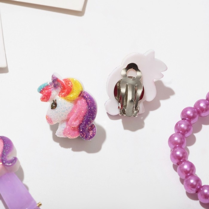 Набор детский "Выбражулька" 5 предметов: 2 заколки, браслет, клипсы, кольцо, единорог, цветной