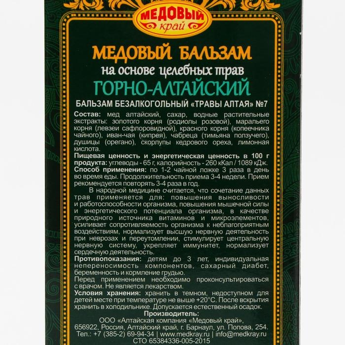 Медовый бальзам «Горно-Алтайский», на основе целебных трав, 250 мл