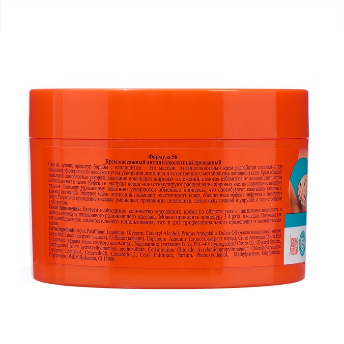 Способ применения: нанести необходимое количество массажного крема на области тела с признаками целлюлита и провести процедуру интенсивного разминающего массажа.