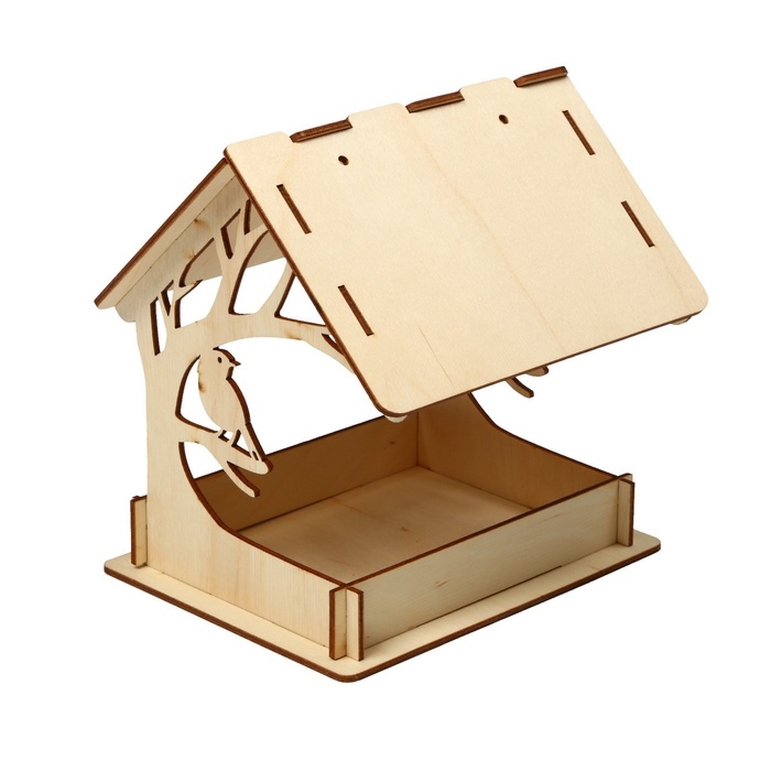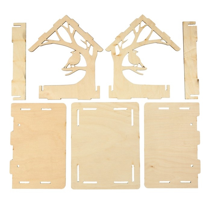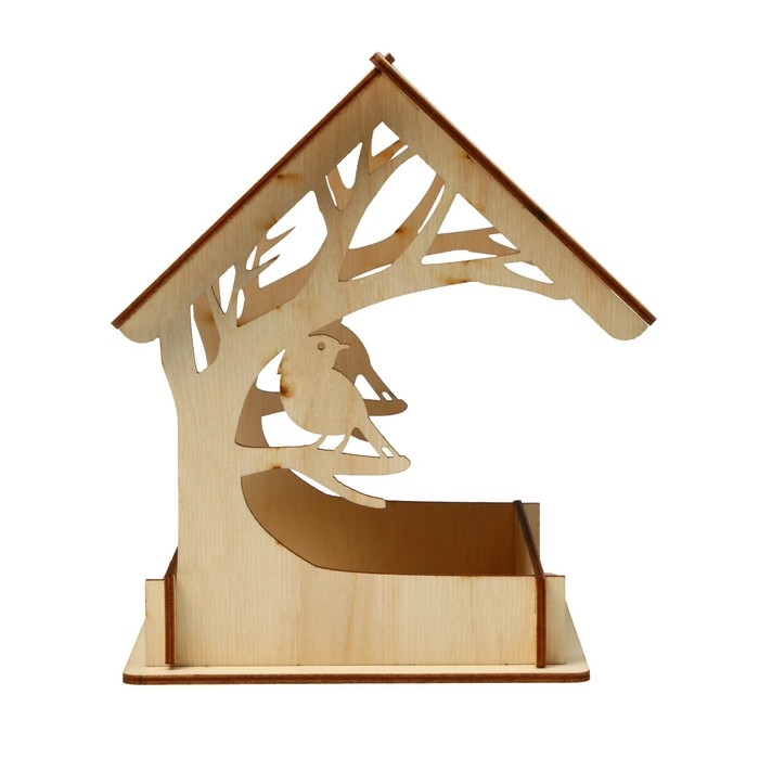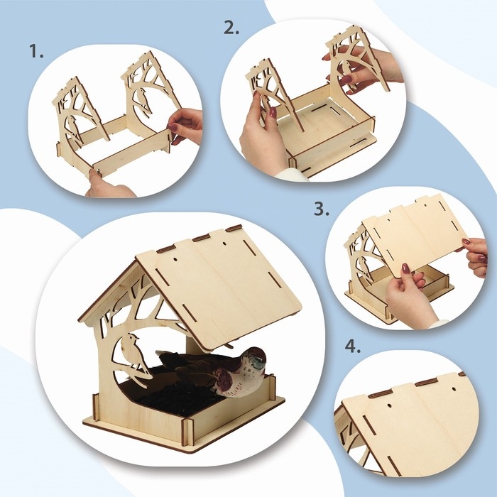 Чтобы собрать кормушку, аккуратно соедините фанерные детали, вставляя их в пазы. Используйте клей для лучшей фиксации. При желании модель можно раскрасить или задекорировать.