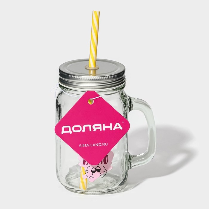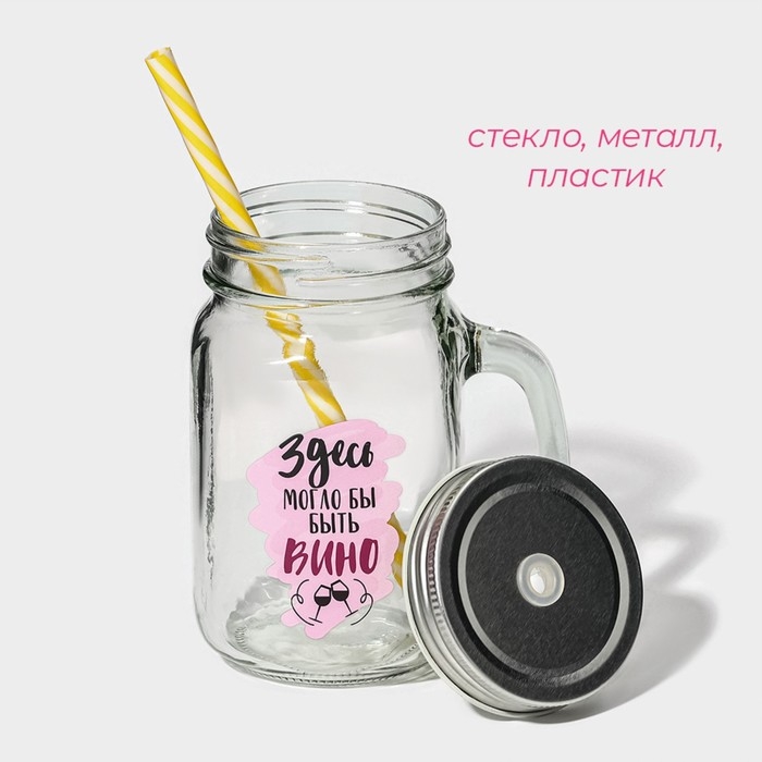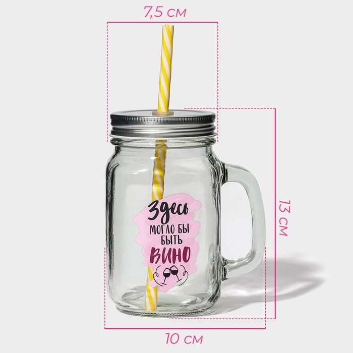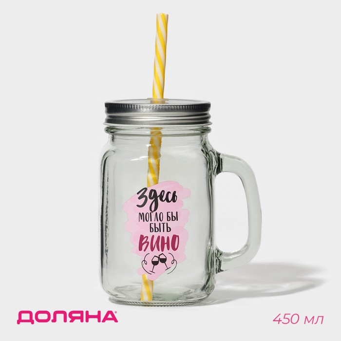 Кружка стеклянная Доляна «Вино», 450 мл, 10×7,5×13 см, с ручкой, крышкой и трубочкой
