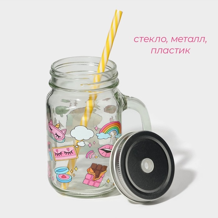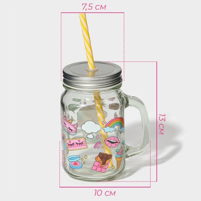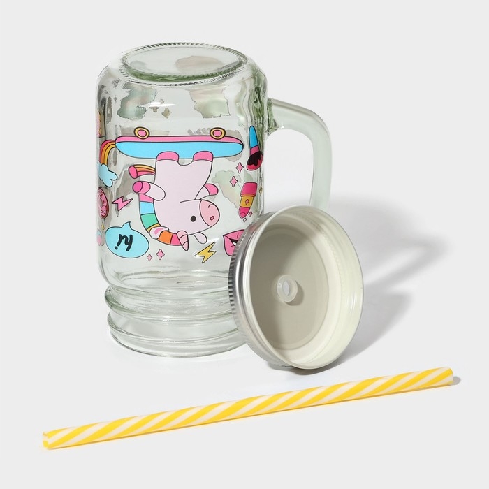 Кружка стеклянная с крышкой и трубочкой Доляна «Единорог», 450 мл, 10×7,5×13 см,