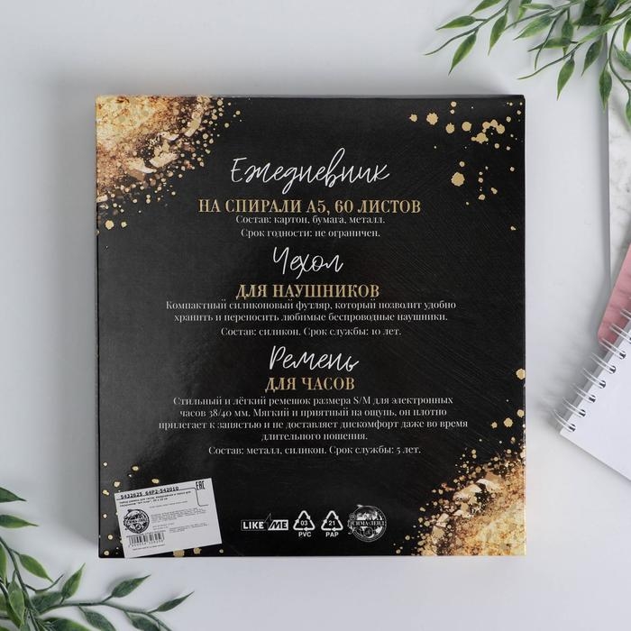 Подарочный набор с ежедневником, ремнём для часов и чехлом для наушников пойдет деловым людям, которые желают всегда оставаться на связи и держать всё под контролем.