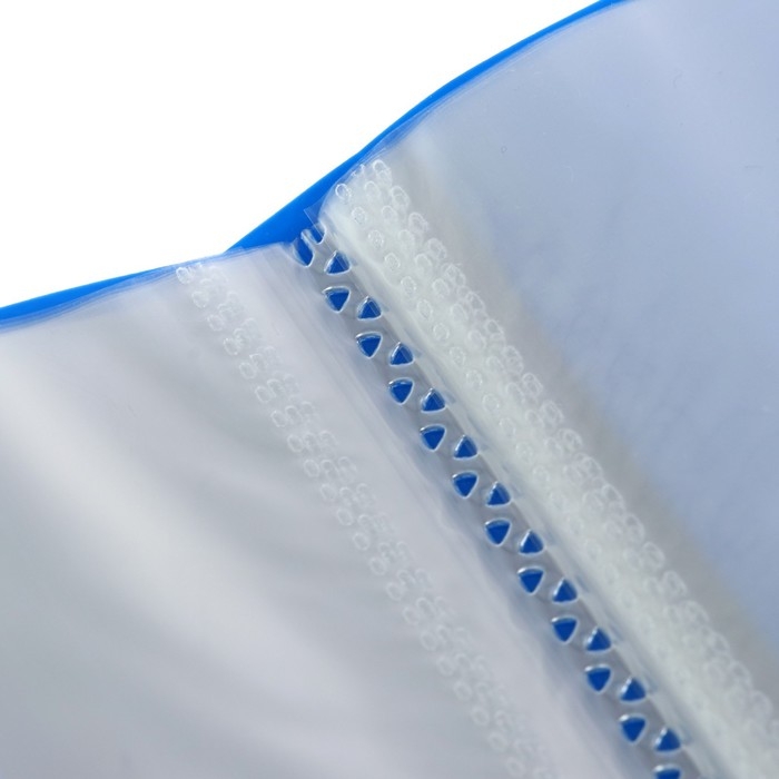 Папка с 20 вкладышами формата А4 – это функциональный аксессуар для работы и учебы, который выполнен в классическом синем цвете. Папка размером 350*235*14 мм изготовлена из плотного пластика толщиной 0,6 мм с текстурой «песок» и предназначена для транспортировки, упорядочивания и хранения бумаг. Ширина корешка 15 мм, на корешке имеется карман, тип скрепления: термосварка. Вкладыши защищают документы от повреждений и загрязнений.