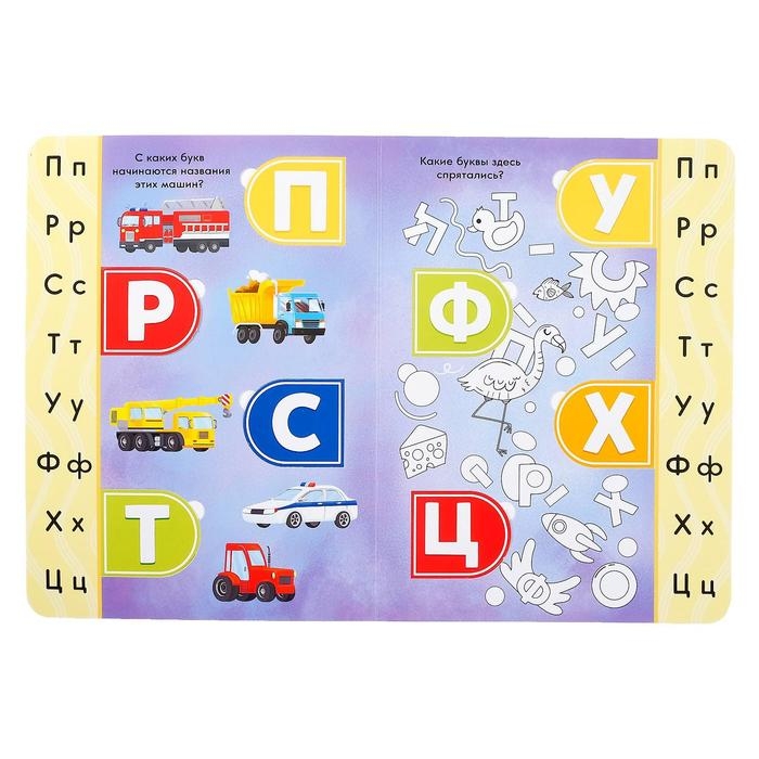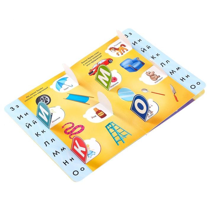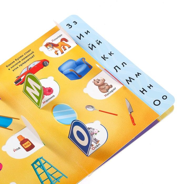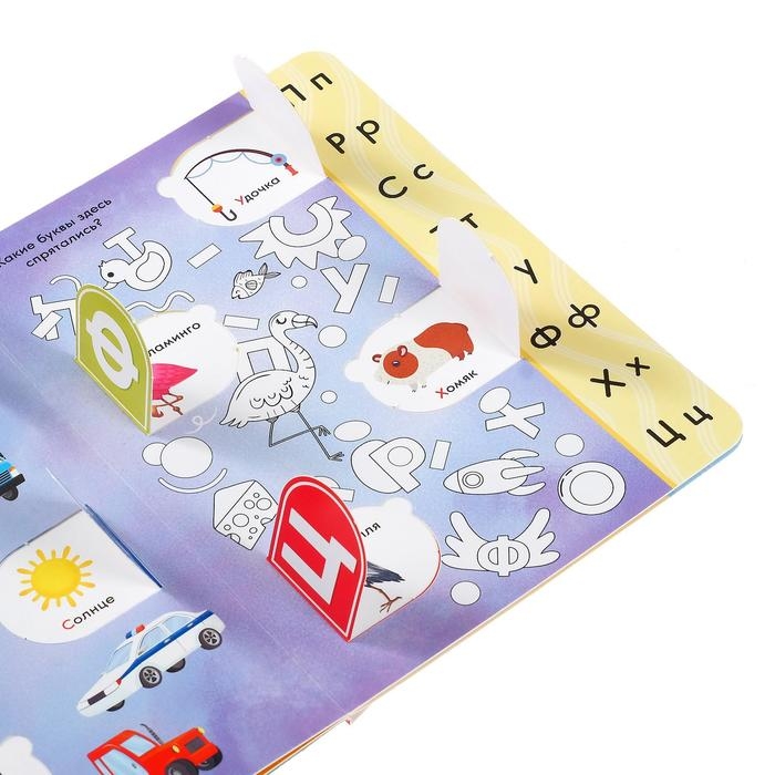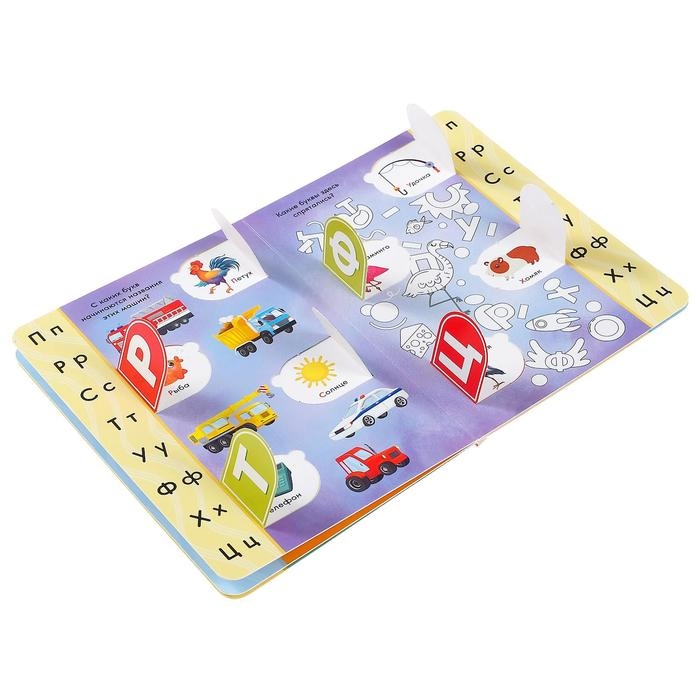Книга сделана из плотного картона, поэтому прослужит долго. Внутри ребёнок найдёт 32 окошка с буквами алфавита и узнает много новых слов. Также в книжке есть много интересных заданий, которые ребёнку нужно выполнить.