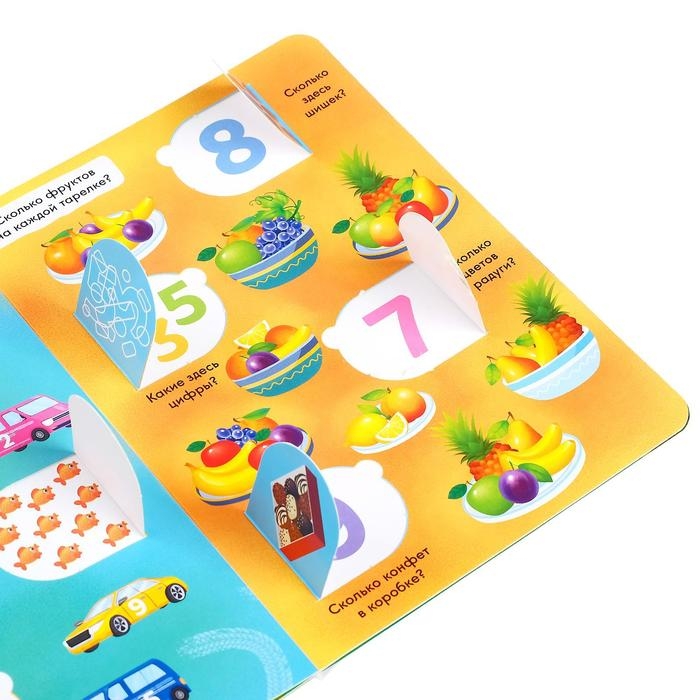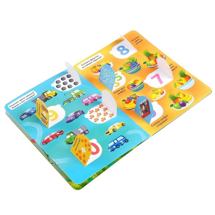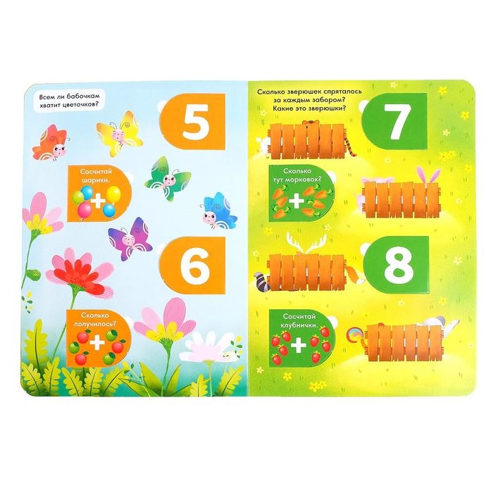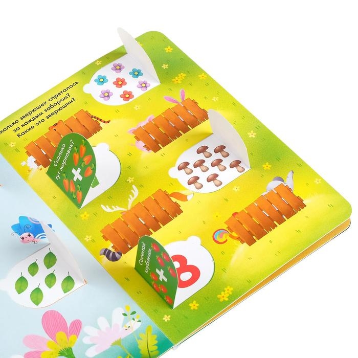 Книга сделана из плотного картона, поэтому прослужит долго. Внутри ребёнок найдёт 32 окошка с яркими изображениями животных, фруктов, овощей и цифр. Также в книжке есть интересные задания на сложение, которые ребёнок выполнит.
