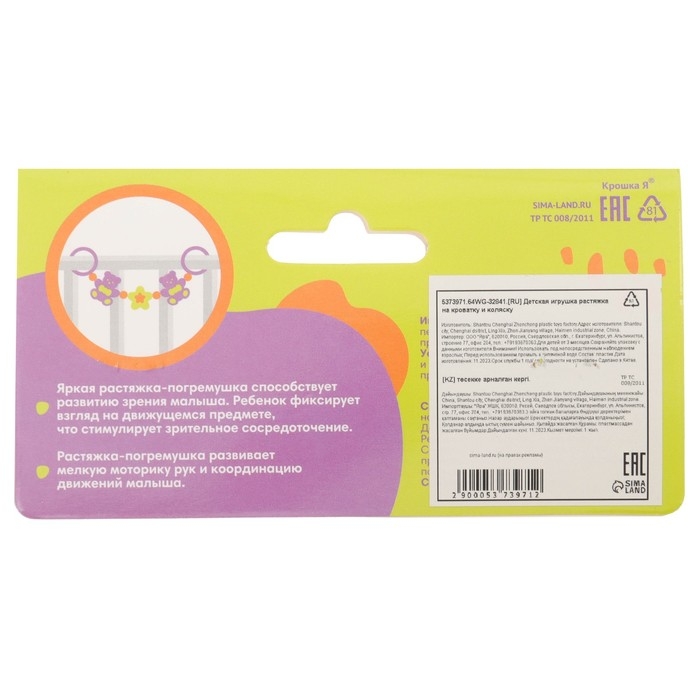 Игрушка-растяжка, которую можно подвесить на бортик детской кроватки, коляску или автокресло. К игрушке прикреплены развивающие элементы.Игрушка-растяжка сделана из безопасных материалов разного цвета и разной фактуры. Игрушка развивает тактильное и визуальное восприятие малыша, а так же служит любимой игрушкой крохи.