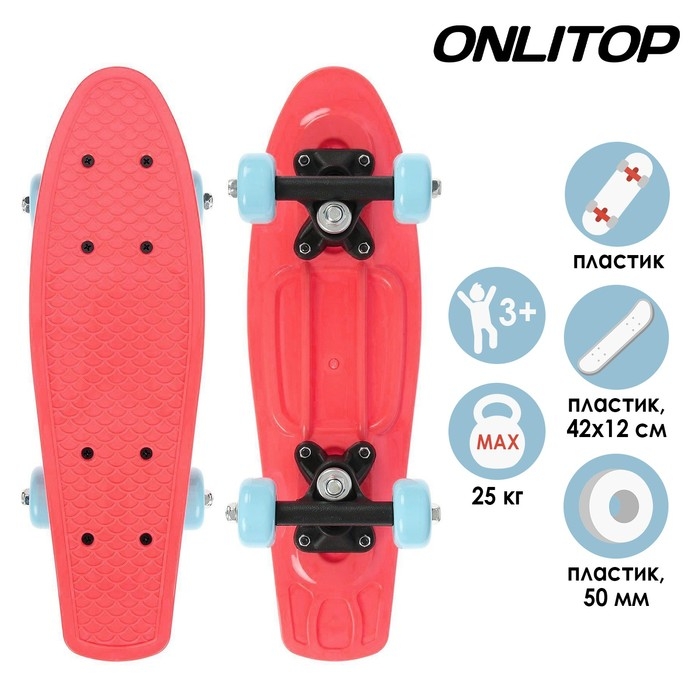 Пенниборд ONLITOP, 42х12 см, колёса PVC 50 мм, пластиковая рама, цвет кораллово-розовый
