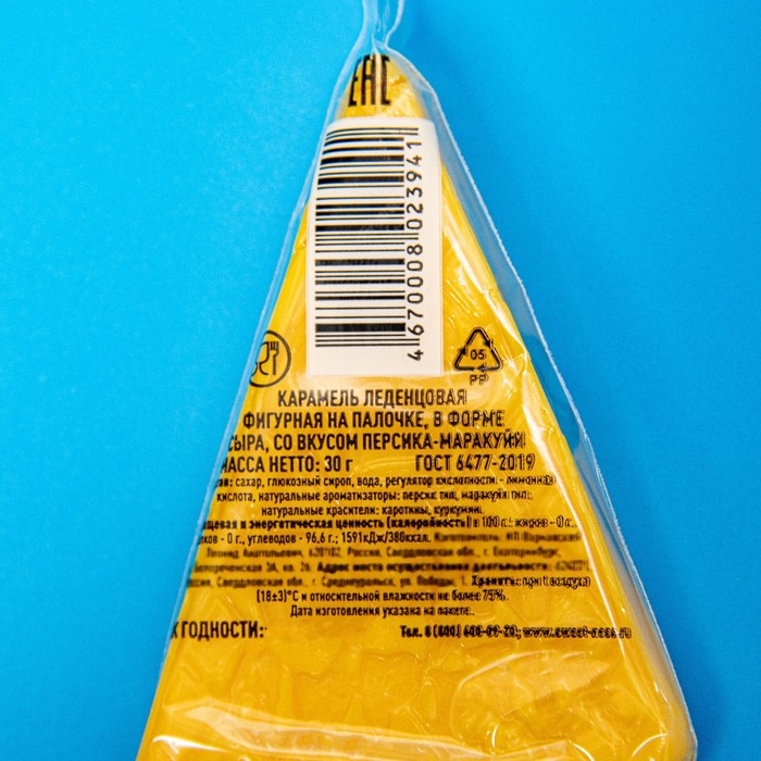 Леденцовая карамель на палочке Sweet Ness в форме кусочка сыра представляет собой оригинальное и аппетитное угощение, которое привлекает внимание не только своим необычным дизайном, но и вкусом. Эта конфета выполнена в виде милого кусочка сыра, что делает ее визуально привлекательной и добавляет элемент игривости. Внутри карамели скрывается восхитительное сочетание вкусов персика и маракуйи, создающее гармоничное сочетание сладости и экзотических нот. Сочный персик и яркая маракуйя наполняют леденец насыщенным и освежающим вкусом, который приятно удивляет и радует.