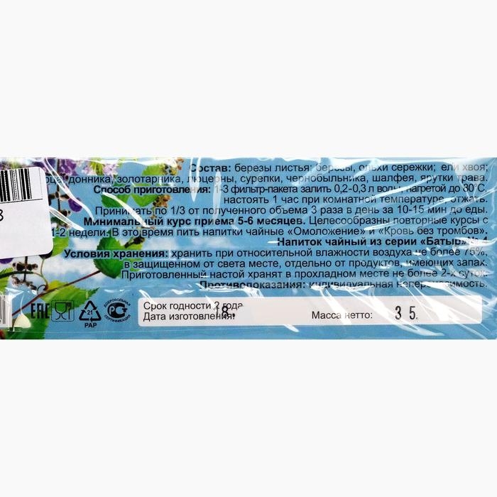Состав: берёзы листья; горца, дербенника, донника, дурнишника, зверобоя, золотарника, зюзника, люцерны медуницы, первоцвета, подмаренника, сурепки, таволги, чабреца, чернобыльника, шалфея, ярутки трава; гречихи цветущие верхушки; ели хвоя; ивы кора; лещины сережки; чага.