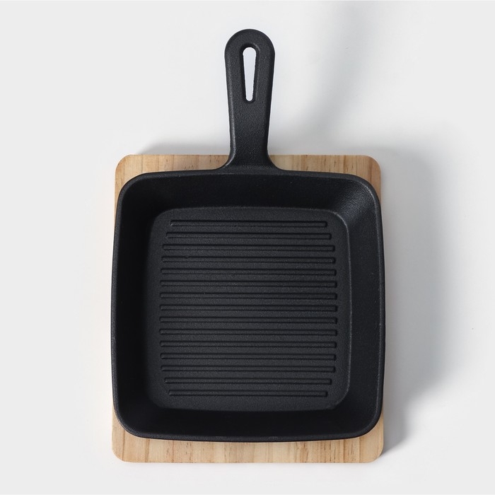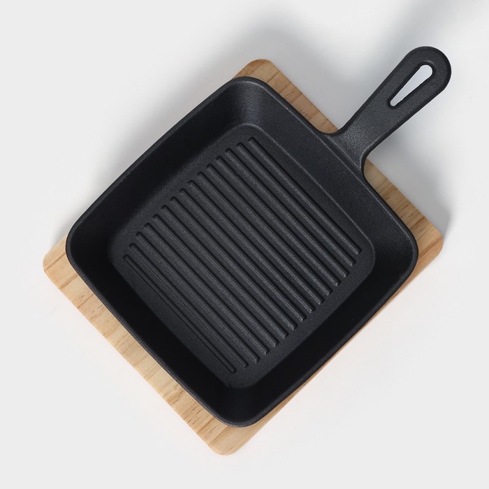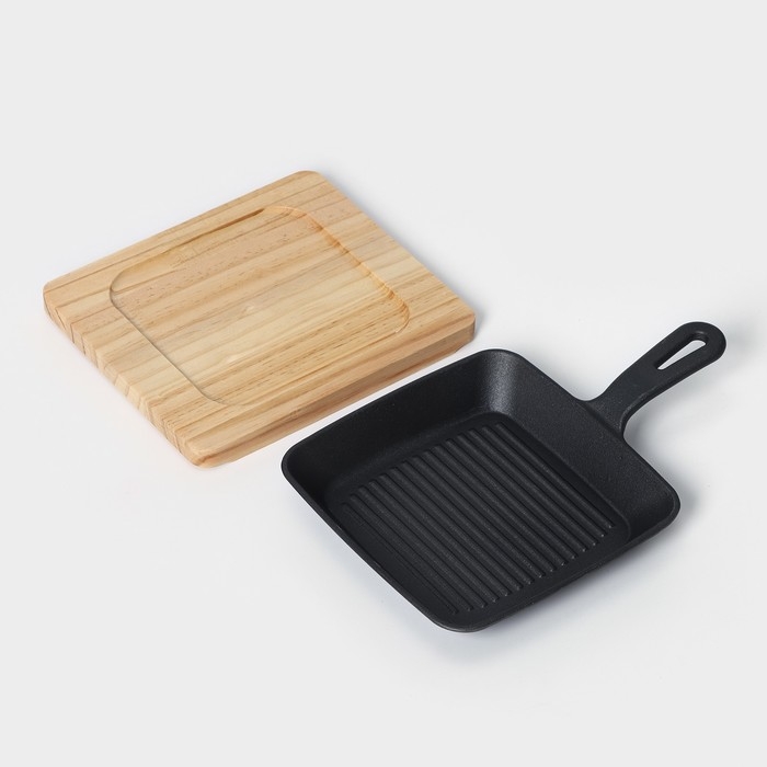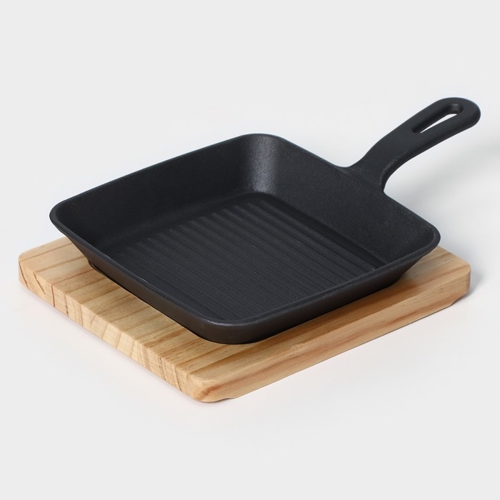 Сковорода чугунная «Квадрат. Гриль», 19×3 см, на деревянной подставке