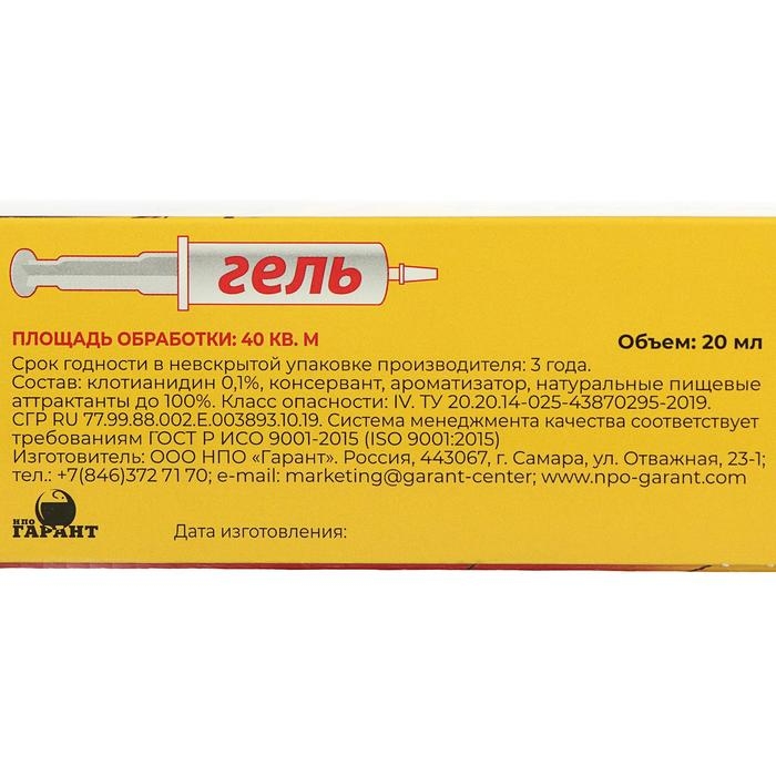 Действующее вещество: клотианидин 0,1%, консервант, ароматизатор, натуральные пищевые аттрактанты до 100%.
