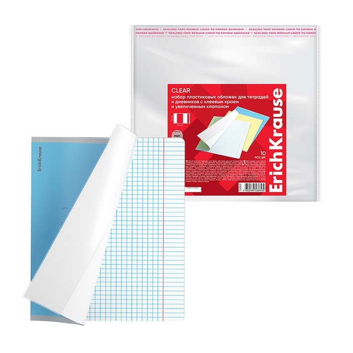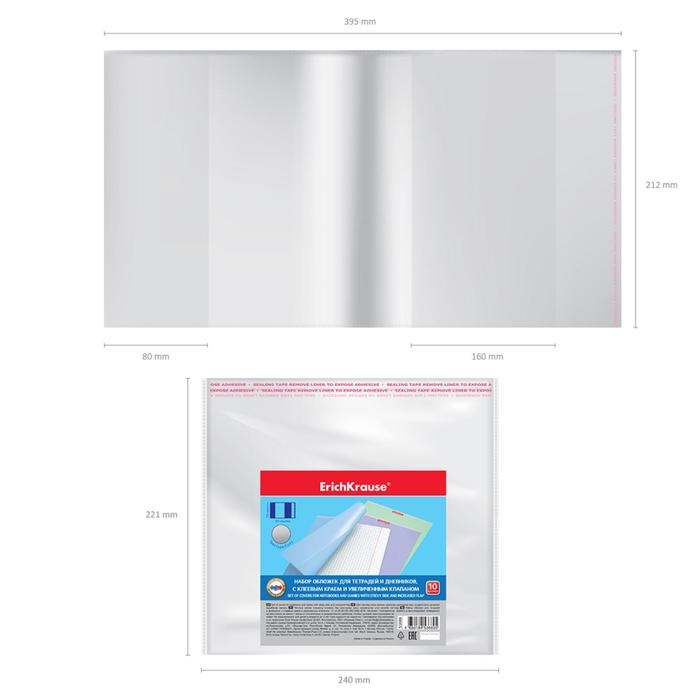 Набор обложек ПП 10 шт, 212 х 395 мм, 80 мкм, ErichKrause "Fizzy Clear", для тетрадей и дневников, с клеевым краем и увеличенным клапаном, с тиснением