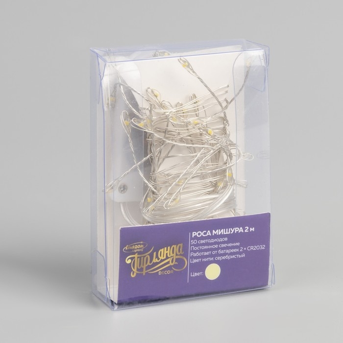 Гирлянда «Мишура» 2 м роса, IP20, серебристая нить, 50 LED, батарейки CR2032х2 (в комплекте), свечение тёплое белое