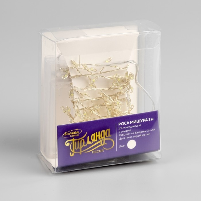 Гирлянда «Мишура» 1 м роса, IP20, серебристая нить, 100 LED, 2 режима, батарейки AAх3 (нет в комплекте), свечение белое