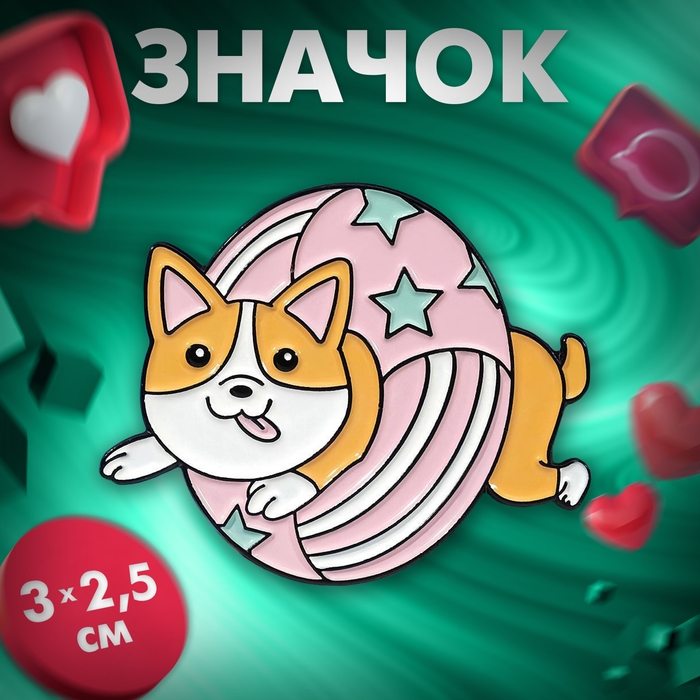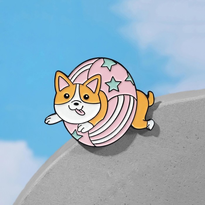 Значок «Щенок корги» в спасательном круге, цветной в чёрном металле