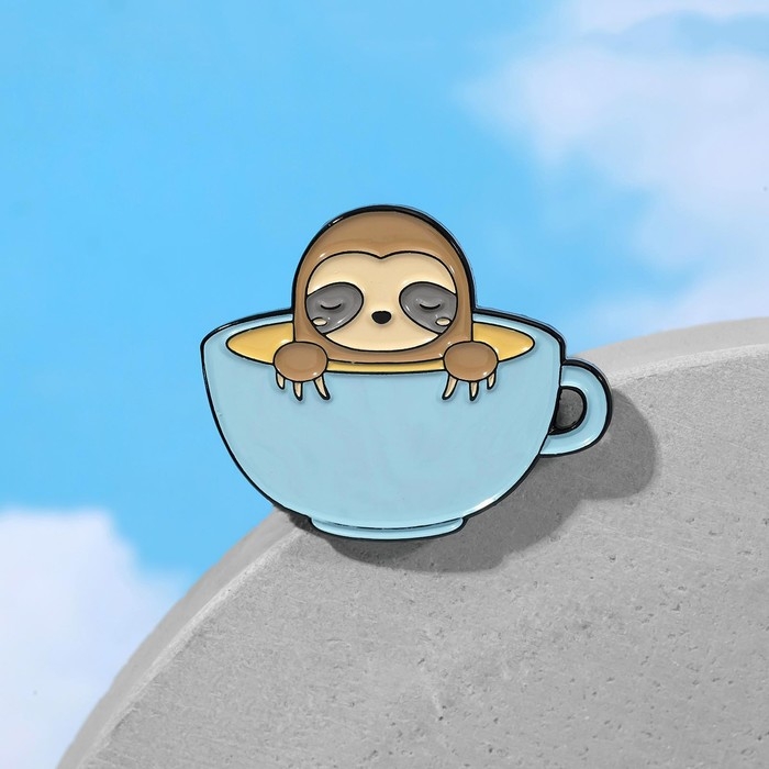 Значок «Ленивец» в кружке кофе, цветной в чёрном металле