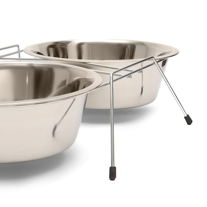 Подставка выполнена из прочного материала и имеет прорезиненные ножки, которые обеспечивают устойчивость подставки на любой поверхности и не дают ей соскользнуть, что гарантирует сохранность мисок и облегчение подачи пищи животному.
