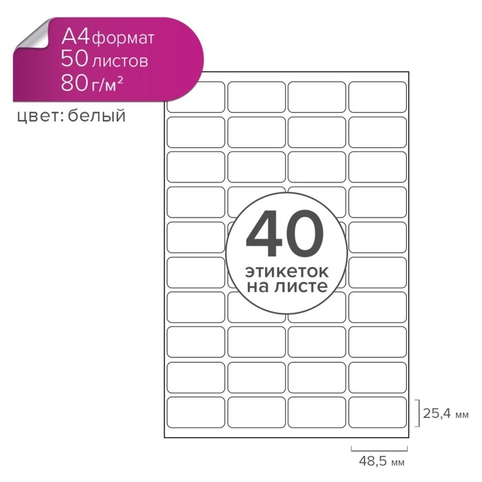 Этикетки А4 самоклеящиеся 50 листов, 80 г/м, на листе 40 этикеток, размер: 48,5 х 25,4 мм, глянцевые, белые
