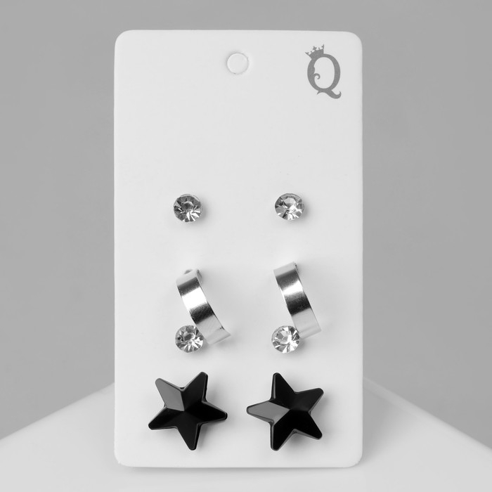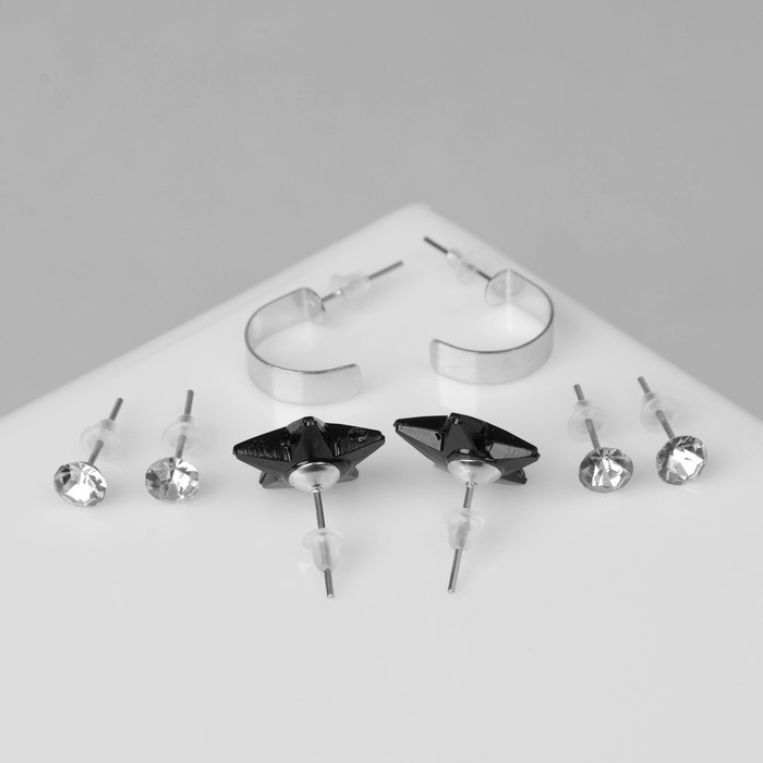 Пусеты 4 пары «Романтика» звёзды, цвет бело-чёрный в серебре
