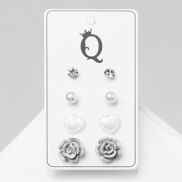 Пусеты 4 пары «Романтика» винтажная роза, цвет бело-серый в серебре