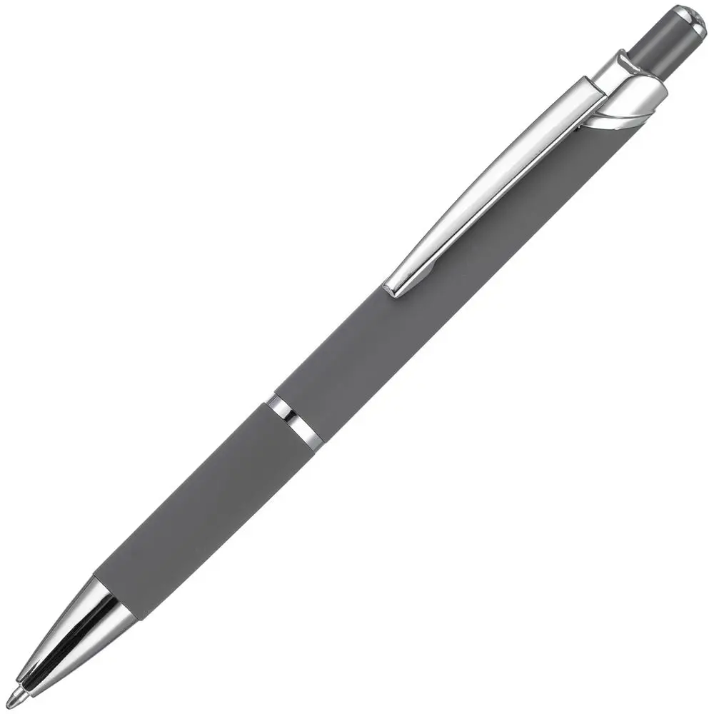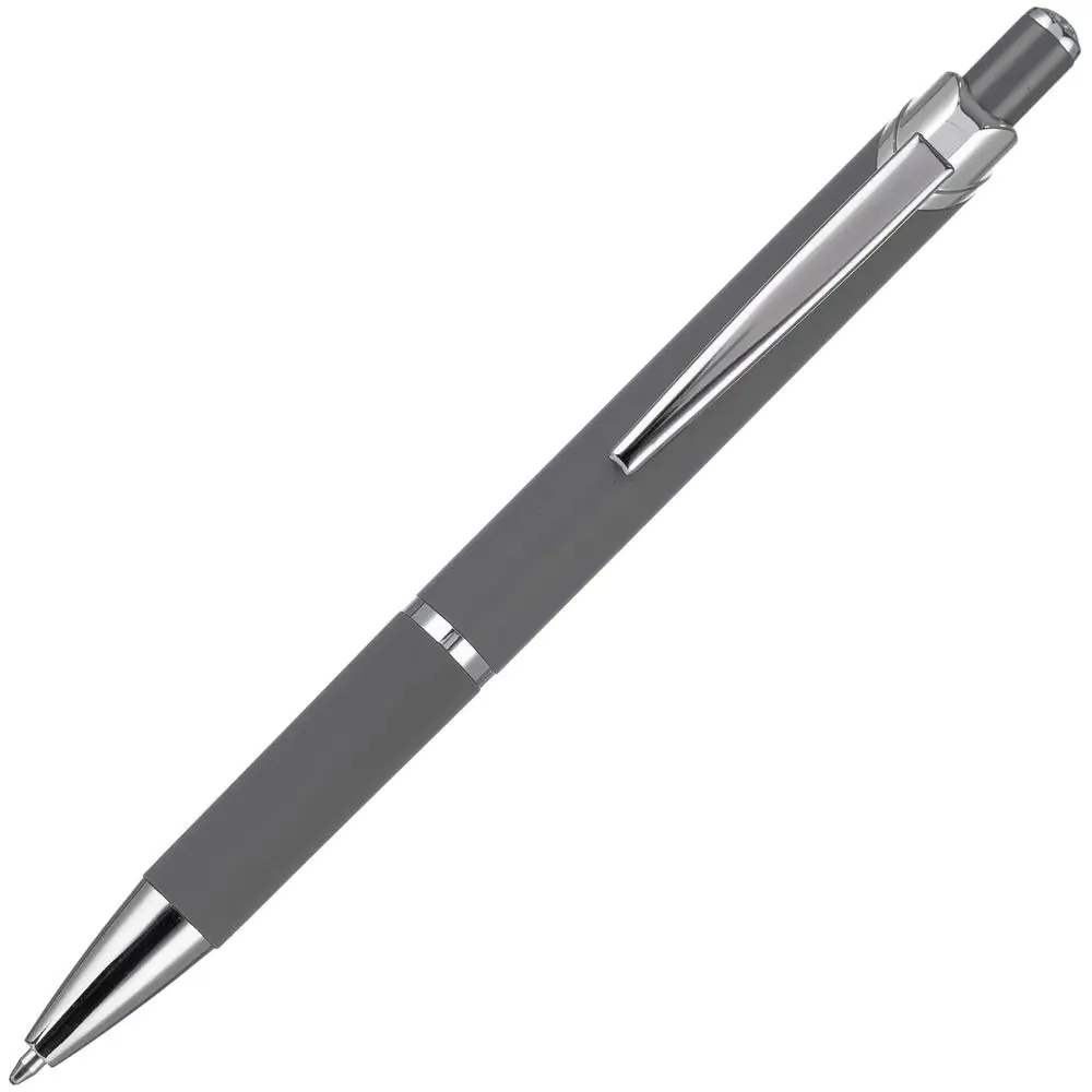 Металлическая ручка с покрытием софт-тач и серебристыми деталями.