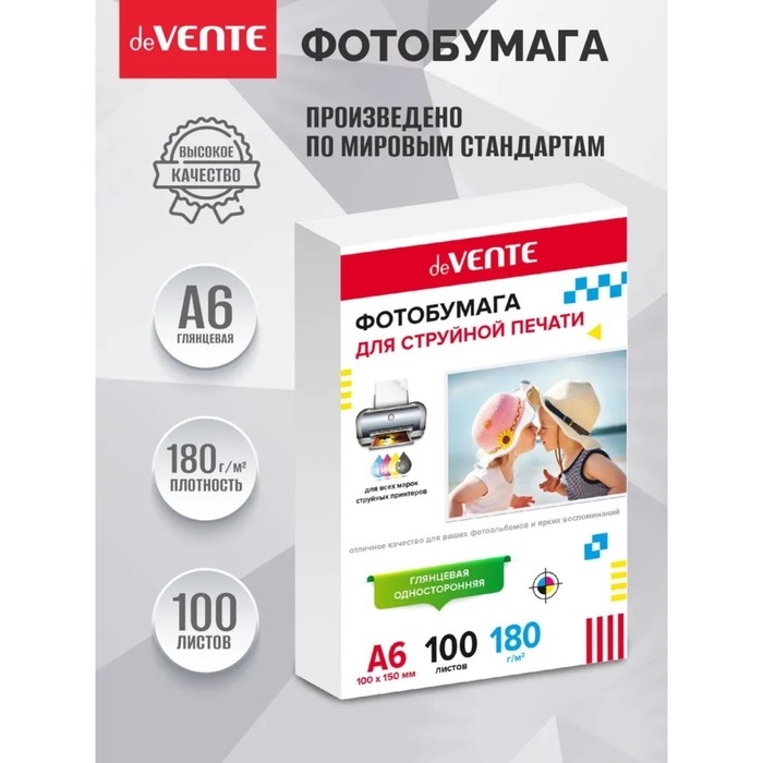 Фотобумага для струйной печати A6 (10 х 15 см), 100 листов deVENTE, глянцевая, односторонняя, блок 180 г/м2