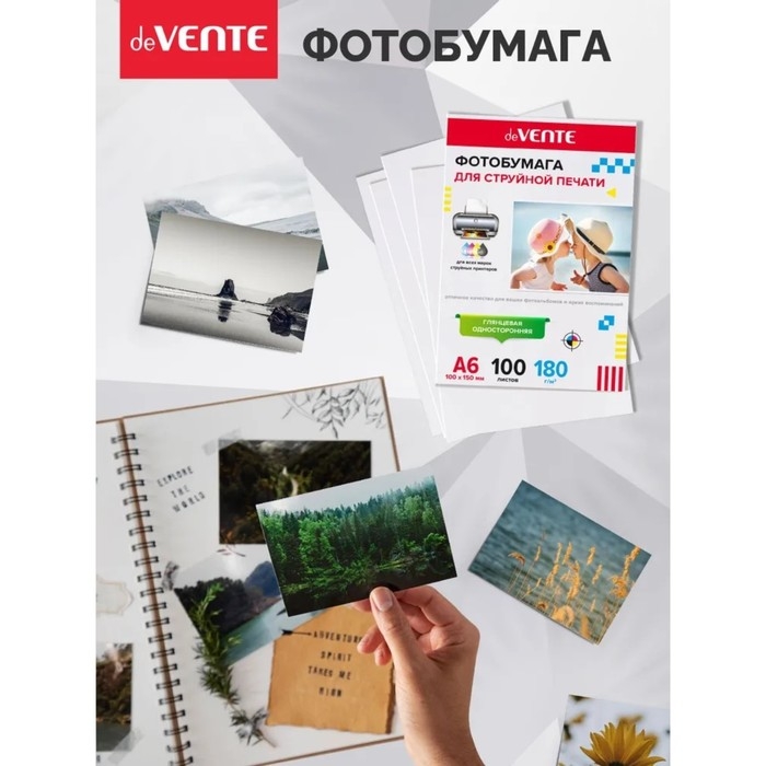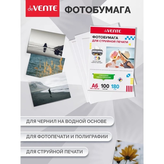 Фотобумага для струйной печати "deVENTE" A6 (10x15 см) 100 листов, 180 г/м2, глянцевая односторонняя, в пластиковом пакете с европодвесом
