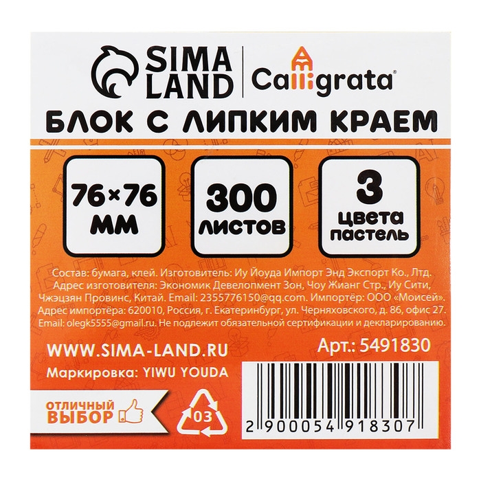 Блок с липким краем 76 мм х 76 мм 300 листов, пастель, 3 цвета