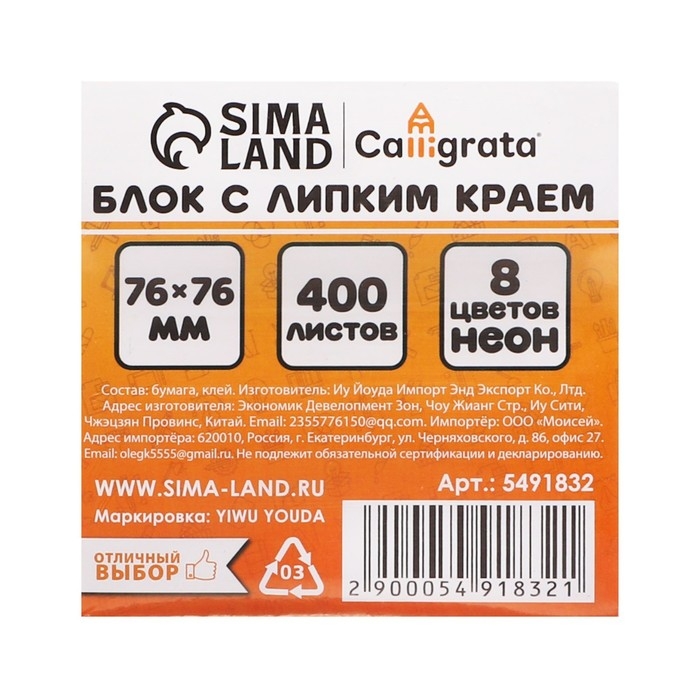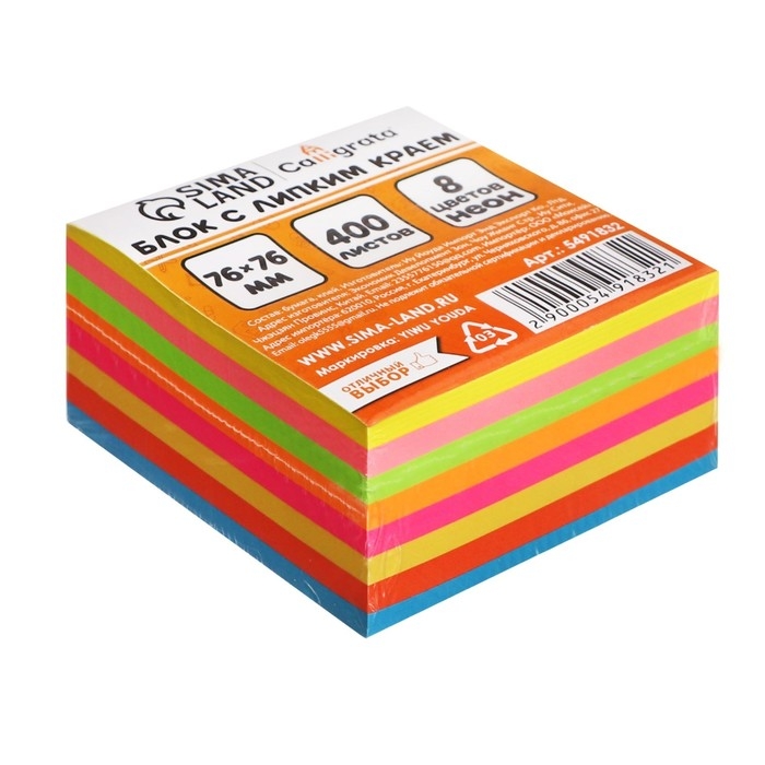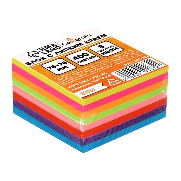 Блок с липким краем 76 мм х 76 мм, 400 листов, флуоресцентный, 8 цветов