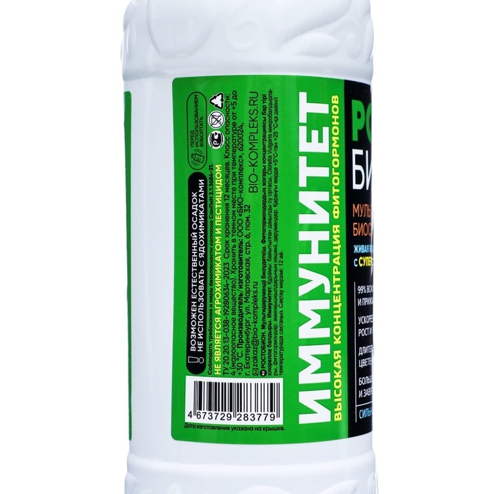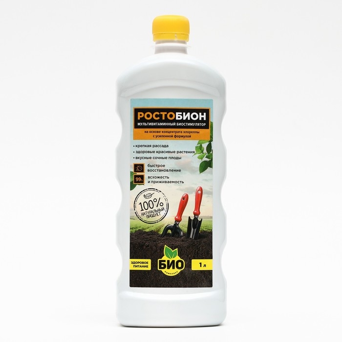 В составе – не только микроводоросли Chlorella Vulgaris, НО и обогащенная культуральная водная среда, фитогормоны (ауксины, гиббереллины, цитокинины), комплекс аминокислот и витамины. Продукт разработан с усиленной формулой для РОСТА, а БИОН – серия российских космических аппаратов, предназначенных для проведения биологических исследований. В результате исследований была разработана усовершенствованная технология, которая используется в Ростобионе для более яркого (по сравнению со стандартным способом производства хлореллы) результата.