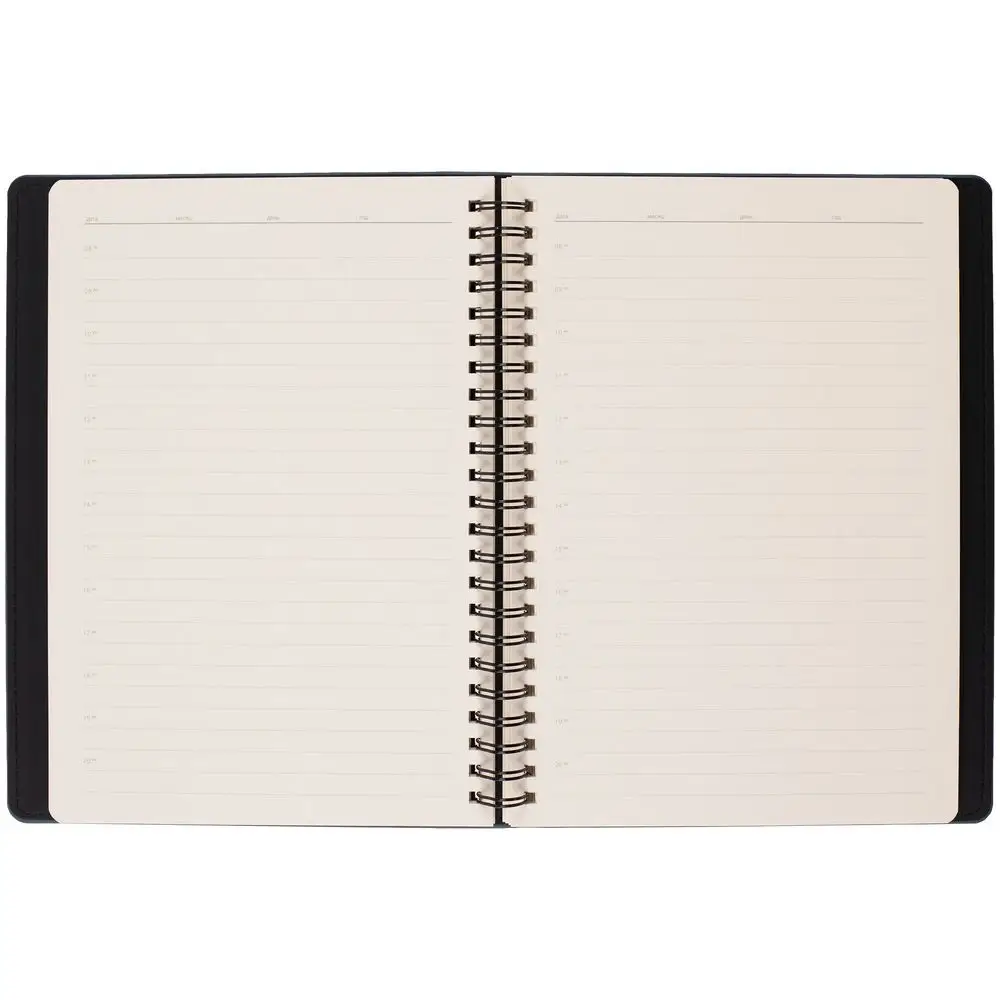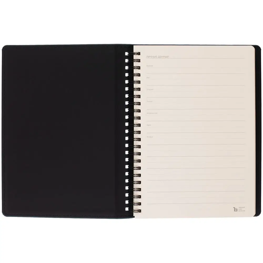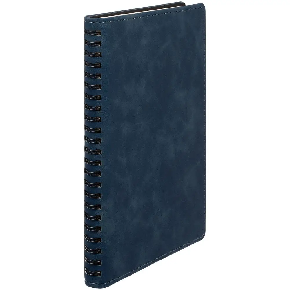 Ежедневник с блоком на пружине в твердой обложке, выполнен из материалов Nubuk Touch, темно-синий XX и Soft Touch, черный AA.