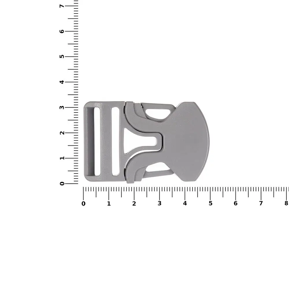 Особенность этой пряжки в том, что она состоит из 3 частей, две из которых крепятся напрямую на изделие, и для их установки необходим специальный инструмент. Третья деталь фиксируется на стропе.