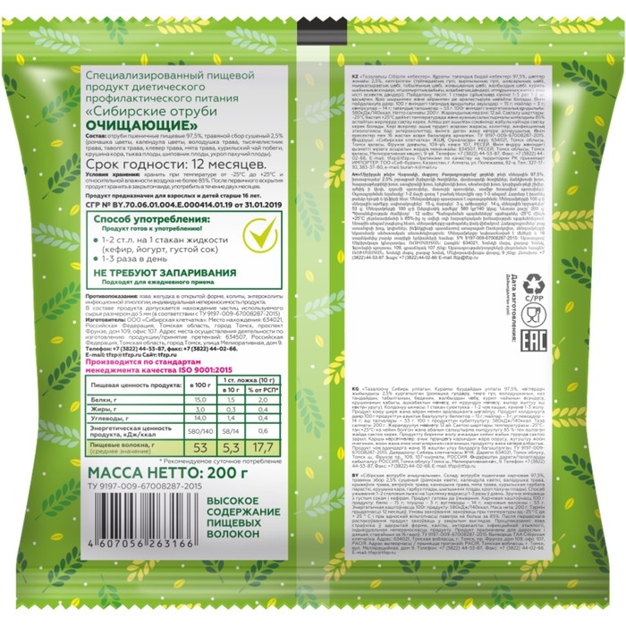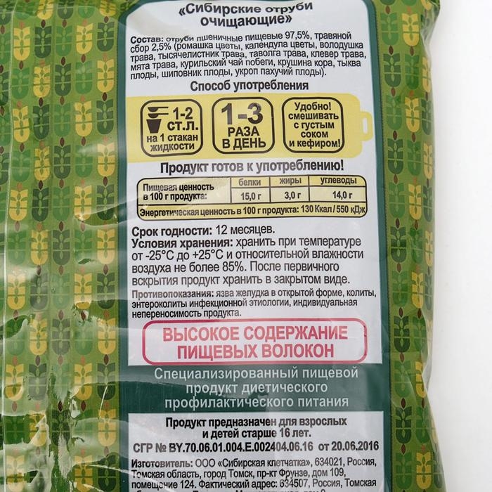 Отруби Сибирские очищающие пшеничные, обогащенные специальным чаем. Очищающий чай (корень лопуха, рябина красная, тыква, крушины кора). Это проверенное средство избавляет организм от шлаков и токсинов, помогает уменьшить вред неправильного питания и неблагоприятных экологических условий. (Имеется СГР)