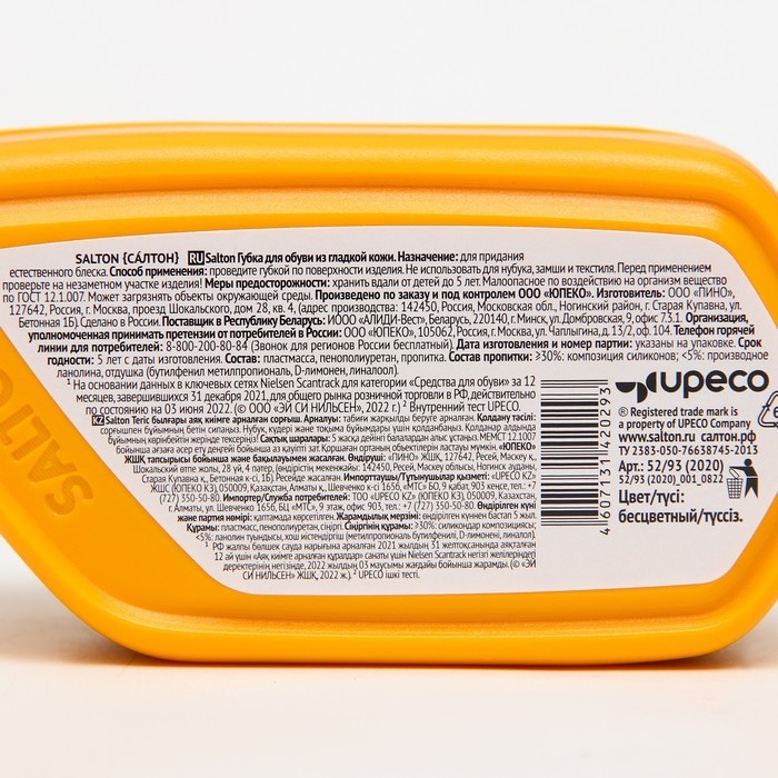 Губка для обуви Salton в форме волны выполнена из упругого и высокого поролона, что не позволяет пластиковым краям корпуса царапать поверхность обуви. Корпус губки из крепкого полистирола плотно прилегает к поролону и надежно смыкается при закрывании, что не дает пропитке быстро высохнуть и увеличивает срок использования изделия. Благодаря содержанию норкового масла и натурального воска ланолина, пропитка увлажняет, смягчает и защищает от загрязнений кожаную поверхность обуви. Губка быстро очищает и придает блеск обуви из кожи любого цвета.
