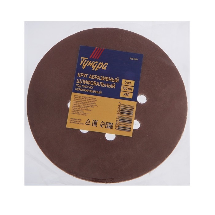 Круг абразивный шлифовальный под "липучку" ТУНДРА, перфорированный, 150 мм, Р60, 5 шт.