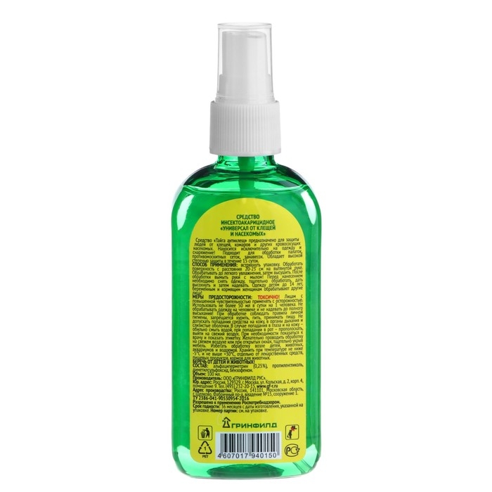 Назначение: универсальное средство от клещей и насекомых.Характеристика: средство предназначено для защиты людей от клещей, комаров и других кровососущих насекомых. Наносится исключительно на одежду и снаряжение. Подходит для обработки палаток, противомоскитных сеток, занавесок. Обладает высокой степенью защиты в течение 15 суток.Способ применения: встряхнуть упаковку. Обработать поверхность с расстояния 20-25 см на вытянутой руке. Обрабатывать до легкого увлажнения, затем высушить. После обработки вымыть руки с мылом. Перед нанесением необходимо снять одежду, тщательно обработать, дать высохнуть и затем надевать. Одежду детям до 14 лет, беременным и кормящим женщинам обрабатывают другие лица.Меры предосторожности: лицам с повышенной чувствительностью применять с осторожностью. Использовать не более 50мл в сутки на 1 человека. Не обрабатывать одежду на человеке и не надевать до полного высыхания. При обработке соблюдать правила личной гигиены, запрещается курить, пить, принимать пищу. Не допускать попадания средства на кожу, в органы дыхания и слизистые оболочки. В случае попадания в глаза и на кожу – обильно смыть водой, при попадании в рот – прополоскать, выйти на свежий воздух. При необходимости показаться к врачу и показать этикетку. Желательно проводить обработку на свежем воздухе или при открытых окнах, тщательно укрыв мебель. Избегать обработку возле детей, животных, аквариумов и водоемов. Хранить при температуре не ниже -5°С и не выше +30°С, отдельно от лекарственных средств, пищевых продуктов, кормов для животныхю.Действующее вещество: альфациперметрин (0,25%), пропиленгликоль, диметилсульфоксид, бензофенон.Форма выпуска: пластиковый флакон.Срок годности: 3 года в невскрытой упаковке производителя.
