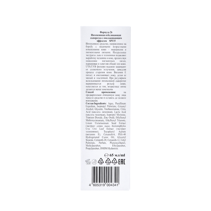 Интенсивная отбеливающая сыворотка "Белый Лен" с омолаживающим эффектом, SPF 15, 65 мл