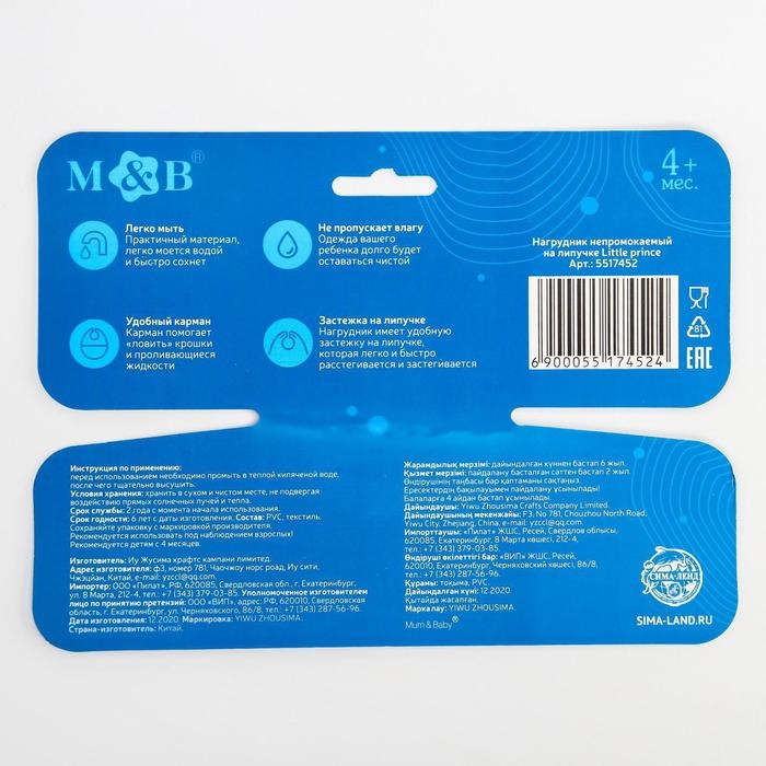 Нагрудник для кормления «Little prince» непромокаемый на липучке, с карманом