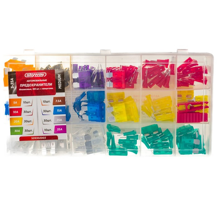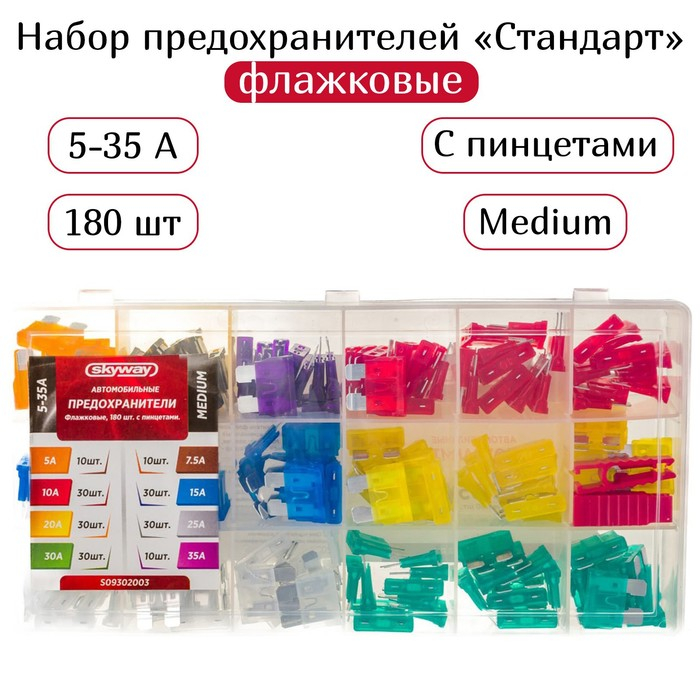 Предохранитель флажковый MEDIUM набор 180шт 5-35А в пластиковой коробке SKYWAY- набор пластмассовых предохранителей, предназначены для защиты бортовой электрической цепи автомобиля от перегрева и коротких замыканий. Изготовлены из термостойкой пластмассы с вставками из цинка. Важнейшая деталь для Вашего автомобиля.