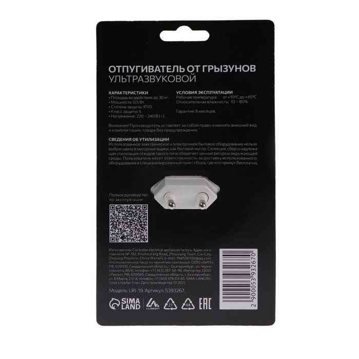 Отпугиватель грызунов Luazon LRI-19, ультразвуковой, 30 м2, 220 В, белый