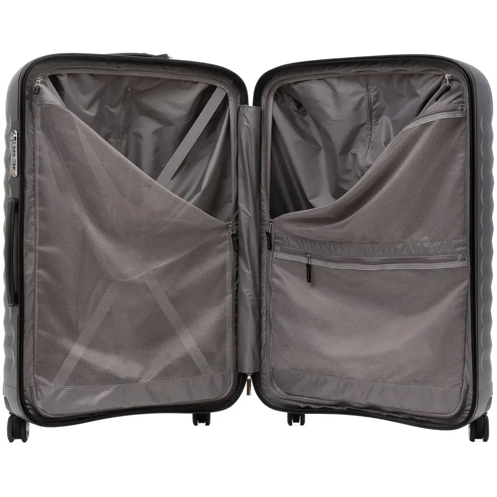 Чемодан E-Lite изготовлен из ударостойкого поликарбоната с интересной ребристой фактурой — смотрится эффектно, а еще противостоит появлению царапин и выгоранию, сохраняя первозданный внешний вид изделия долгое время.
