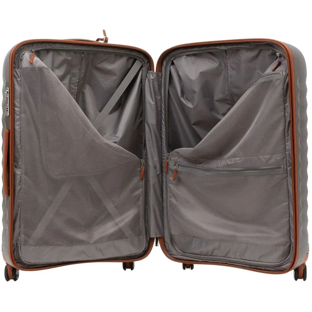 Наружные и внутренние элементы — ручки, фурнитура, обрамление молний и адресная бирка — выполнены из натуральной кожи, благодаря чему чемодан E-Lite приобретает по-настоящему изысканный вид.